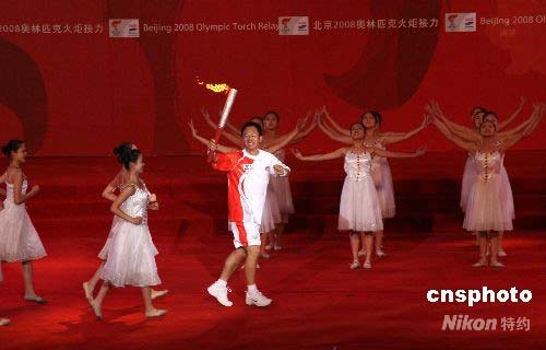 5月26日下午,扬州市最后一棒火炬手王修文手举“祥云”火炬,抵达奥运火炬接力扬州站传递的终点——扬州市体育公园。 中新社发 周兆军 摄