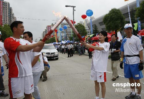 5月28日上午8时,北京奥运会火炬接力安徽的传递活动在合肥拉开帷幕。合肥籍世界跳水冠军李娜担任第一棒火炬手。图为李娜将圣火传递给抗震勇士合肥市特警支队的火炬手周世军。中新社发 张娅子 摄