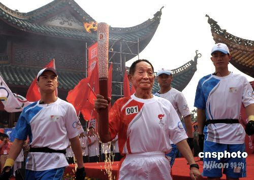 6月3日,奥运圣火开始在湖南岳阳传递,中国杂交水稻之父袁隆平在岳阳楼前传递湖南第一棒火炬。 中新社发 廖攀 摄