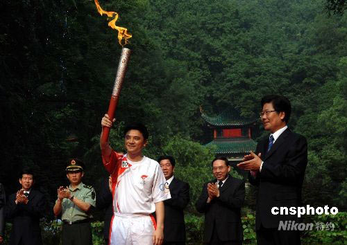 6月4日,奥运会跳水冠军、湖南省体育局的副局长熊倪在爱晚亭前从湖南省委书记张春贤手中接过火炬,开始奥运圣火长沙站传递。中新社发 廖攀 摄