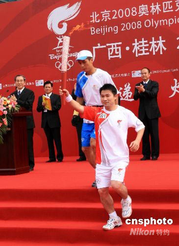 6月6日,北京奥运圣火在广西桂林传递,举重奥运冠军唐灵生担任第一棒火炬手。中新社发 周兆军 摄