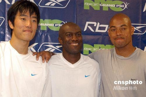 北京时间7月6日消息,在当日进行的美国田径奥运选拔赛110米栏争夺中,刘翔最伟大的对手阿兰-约翰逊小组赛伤势复发,未能完成比赛,七次世界冠军冲击北京奥运的征程提前划上句号。另一位劲敌,曾跑出12秒90的阿诺德也在1/4决赛抢跑被罚出,将缺席北京奥运。资料图为刘翔、阿兰-约翰逊(中)、阿诺德(右)三人的合影。中新社发 刘小青 摄