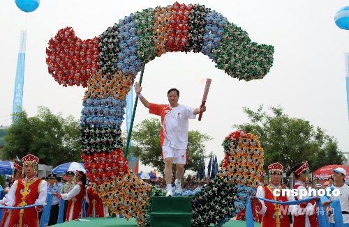 7月10日,奥运火炬在内蒙古赤峰市进行传递。火炬手于建设穿过用福娃组成的“玉龙”。在赤峰翁牛特旗出土的红山文化标志性文物——玉龙,被史学界定为“中华第一龙”。中新社发 廖攀 摄