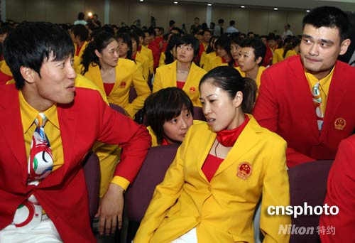 7月25日,参加北京奥运会的中国体育代表团在北京正式成立,两位中国人气最高的体育明星刘翔与姚明用上海话唠家常。 中新社发 任晨鸣 摄