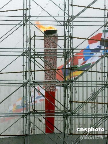 7月28日,青岛奥帆中心准备在北京奥运会期间点燃的火炬提前试点燃。据工作人员介绍这是调试火焰的大小和空气浓度,以获取最佳效果。 中新社发 罗波 摄