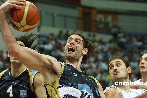 7月31日,国际篮联2008钻石杯男篮比赛继续在江苏南京进行。在塞尔维亚男篮与阿根廷队的比赛中,阿根廷队员奥博托在进攻中怒吼。最终阿根廷以75比60胜出。中新社发 盛佳鹏 摄