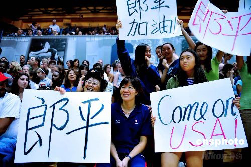 当地时间7月31日,郎平和美国女排在加州大学伯克利分校的排球馆做启程赴北京前的最后热身时,受邀和华人华侨球迷合影。郎平将率美国国家女排于美西时间8月1日从旧金山启程赴中国参加2008年夏季奥林匹克运动会。美国国家女排目前在国际排名为第四位。在1984年和1992年的奥运会上,分别获得银牌和铜牌。中新社发 陈钢 摄
