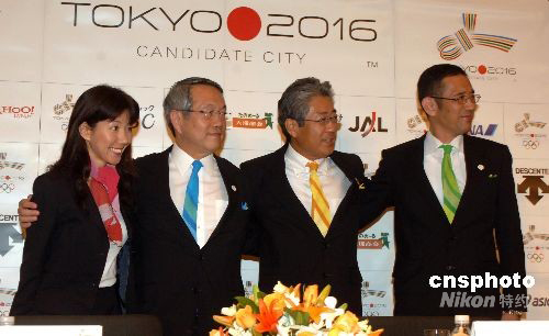 8月4日,东京2016年奥运会申办委员会在北京举办东京申办2016年奥运会新闻发布会。图为日本奥林匹克委员会主席、东京2016年奥运会申办委员会副主席竹田恒和(右三)、东京2016年奥运会申办委员会主席兼首席执行官河野一朗(右二)、东京都政府申办推广部执行总监中村年长(右一)、东京2016年奥运会申办委员会国际宣传部总监仲川美穗子(左一)在会上合影。中新社发 邹宪 摄