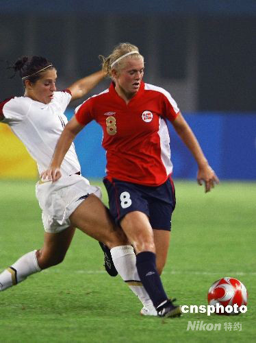 8月6日晚,北京奥运会足球女子预赛,挪威对美国的比赛在秦皇岛奥体中心举行,最终挪威队2:0战胜美国队。