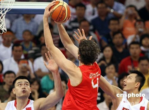 北京奥运会男子篮球小组赛第二轮赛事8月12日开始,首战负于“梦八队”的中国男篮在姚明率领下向世锦赛冠军西班牙队发起猛攻,在一路领先的大好局面下被西班牙队在终场时扳平,经过加时赛以75比85告负。中新社发 任晨鸣 摄