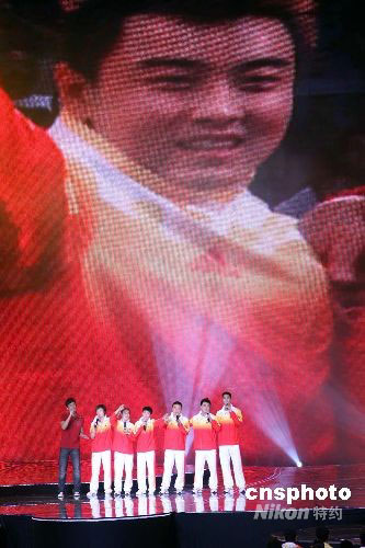 图为乒乓球金牌选手张怡宁、王楠、马琳、王皓等与歌星毛宁合唱歌曲。