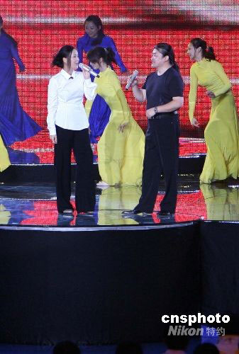 图为著名歌星刘欢和那英登台高歌,将晚会推上高潮。
