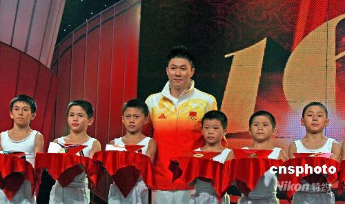 9月25日,湖南省人民政府授予李小鹏湖南功勋运动员称号,授予其教练陈雄功勋教练员称号。李小鹏在当晚举行的《为奥运湘军喝彩》的颁奖晚会上第一次与自己的十六枚奖牌团聚,其中的一枚奖牌曾为四川地震灾区筹集赈灾款而拍卖。中新社发 张家根 摄