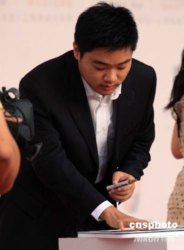 9月28日,2008年斯诺克上海大师赛揭幕,中国斯诺克领军人物之一的丁俊晖低调面对赛事,沉稳地留下“明星手印”。将于29日开打的本次大赛,共云集世界排名前16的斯诺克高手、16位资格赛选手,以及7位中国外卡选手同场竞技。中新社发 潘索菲 摄