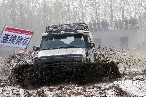 10月17日,2008华东地区汽车场地越野邀请赛决赛在安徽淮北市举行。比赛分为男子、女子两个组别,赛场设计了包括炮弹坑、深水池、跷跷板、沼泽地等18个障碍,来自华东地区百余顶尖车手、近60辆赛车齐聚淮北,各施绝技。中新社发 万善朝 摄