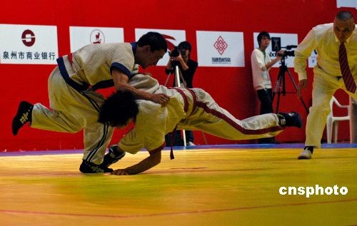 十月二十七日,第六届全国农运会“中国式摔跤”在泉州侨乡体育馆正式开赛。此次比赛共有来自全国各地十个级别的八十名运动员参赛。“中国式摔跤”是种类繁多的中国功夫当中最具中国特色的,运动员身穿短上衣、系腰带、穿长裤,可以抱腿、绊脚、扯肩、扭腰等动作,只要把对方摔倒在地就能得分。中新社发 傅丹丹 摄