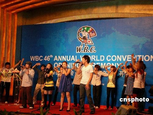 11月3日上午,2008世界拳击理事会(WBC)第46届年会在成都锦江宾馆开幕,来自35个国家和地区的300多名拳击界人士与会。年会除探讨有关WBC的工作和未来规划外,与会人士还将到都江堰地震灾区参加“向勇敢者致敬”的活动。中新社发 杨杰 摄