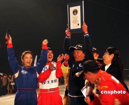 11月2日晚,在山东临沂正直驾校内,中央电视台正大综艺栏目组及吉尼斯总部工作人员一起见证了一项新的吉尼斯世界纪录的诞生——正直驾校特技队以两轮行驶,穿越车身立起高度加上66厘米的限宽门,刷新了一项新的世界纪录(上次世界纪录是车身高加67厘米的宽度)。央视节目主持人朱迅现场主持。中新社发 朱桂文 摄