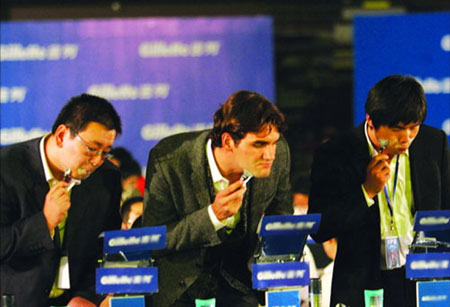 在上海率千余少年集体剃须,费德勒现场向工作人员及大学生示范如何剃须。