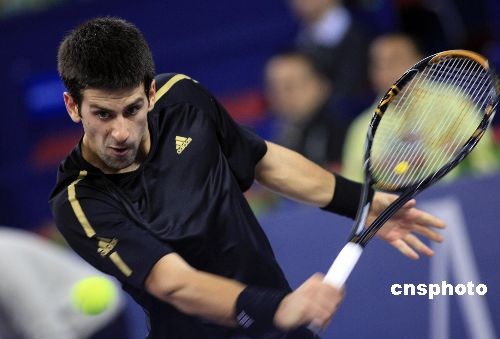 11月9日,2008年上海网球大师杯在上海旗忠网球中心拉开战幕。在当日进行的金组首场比赛中,塞尔维亚小天王德约科维奇以2比0战胜阿根廷选手德尔波特罗,迎来自己在上海网球大师杯上的首场胜利。去年,德约科维奇首次亮相上海网球大师杯,小组赛3战尽墨。中新社发 汤彦俊 摄