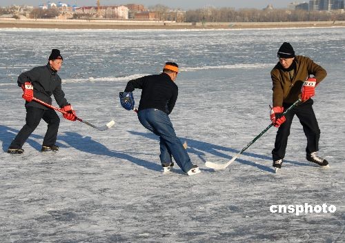 11月10日,黑龙江省黑河市冰上群众体育活动启动。黑河市勇士冰球队队员在封冻的中俄界河黑龙江上训练。中新社发 邱齐龙 摄
