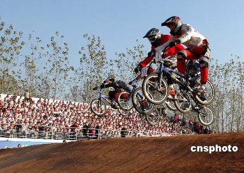 2008年11月10日,由国家体育总局自行车击剑运动管理中心主办、江苏省宿迁市人民政府承办的“洋河蓝色经典”全国自行车BMX(即小轮车)冠军赛在宿迁开赛。来自全国16个省市小轮车专业队、俱乐部,代表着我国BMX竞速最高水平的100余名运动员,参加了成年男子、成年女子、青年女子组的比赛。2008年全国BMX小轮车冠军赛共分五站进行,11月10日~12日的第一站、第二站比赛在江苏宿迁举行。中新社发 柏志勇 摄
