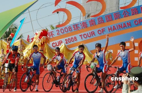 11月11日,“红塔杯”2008环海南岛国际公路自行车赛在三亚鸣枪开赛。在首日3.1公里的序幕赛中,来自哈萨克斯坦国家队的156号选手德米特里·格鲁扎得夫夺得冠军,他同时还获得了“亚洲最佳”和个人总成绩第一名;来自俄罗斯国家队的112号选手伯瑞斯·斯皮尔斯基获得序幕赛第二名;来自美国吉利百利洲际队的63号选手查尔斯·胡弗获得序幕赛第三名。中新社发 尹海明 摄