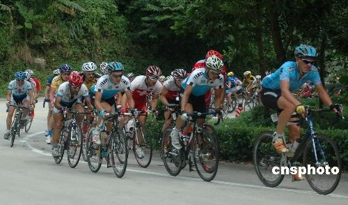 11月17日,二00八环海南岛国际公路自行车进行第六赛段儋州至昌江的比赛,主要是山路赛段,全程总距离为135.5公里,20支队伍111名运动员参赛。整个赛程有三个爬坡点,两个冲刺点。俄罗斯国家队112车手伯瑞斯·斯皮尔斯基以3小时4分57秒的成绩,获得分赛段冠军。图为参赛车手在比赛中爬坡前行。中新社发 付美斌 摄
