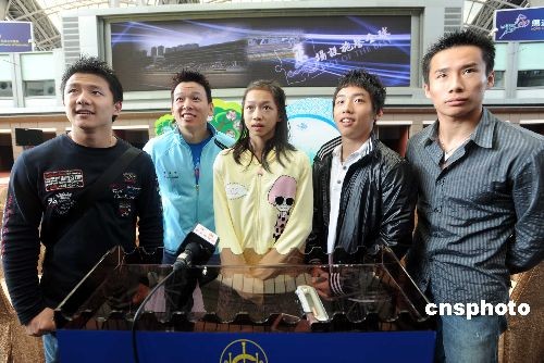 十一月二十日,北京奥运金牌运动员代表团再度访港,并获邀出席香港沙田马场三十周年祝愿仪式。图为奥运体操金牌运动员(左起)陈一冰、黄旭、江钰源、邹凯及肖钦接受媒体访问。中新社发 邓庆乐 摄