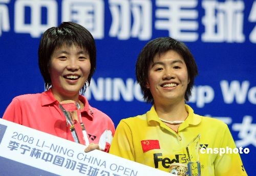 11月23日,在上海举行的2008年中国羽毛球公开赛女子单打决赛,在两位中国羽坛“小花”之间展开,最终23岁的蒋燕皎以2比0击败22岁的队友朱晶晶夺得冠军,这是蒋燕皎首次夺得国际羽联超级赛冠军。朱晶晶获得亚军。图为蒋燕皎(左)与朱晶晶(右)在领奖台上合影。中新社发 汤彦俊 摄