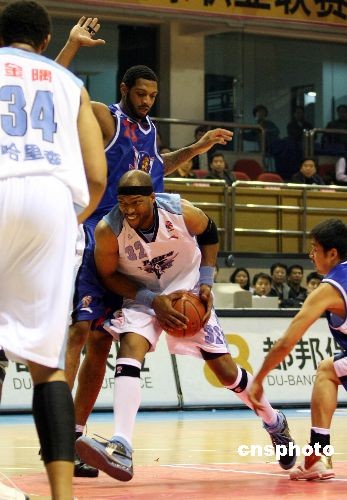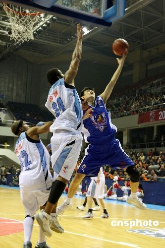 11月23日,在2008—2009赛季CBA联赛第四轮比赛中,北京金隅队主场战胜天津荣钢队,获得联赛开始后的首场胜利。三连败后的北京金隅回到主场迎接天津荣钢的挑战。开场后天津队双外援发挥出色,比分领先,但北京金隅很快适应了天津队的打法,加强防守限制了对方外援在内线的发挥,在第四节逐渐将分差拉大,逐步奠定了胜势,最终将比分定格在98比84。中新社发 王韶骅 摄