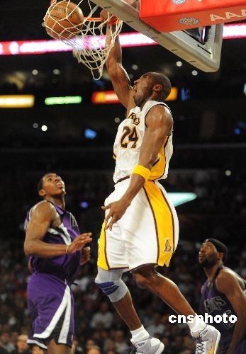 当地时间十一月二十三日晚,NBA洛杉矶湖人队在主场迎战萨克拉门托国王队。最终湖人队以一百一十八比一百零八击败国王队,迎来四连胜,国王遭遇两连败。科比此役得到二十四分和六次助攻。中新社发 张炜 摄