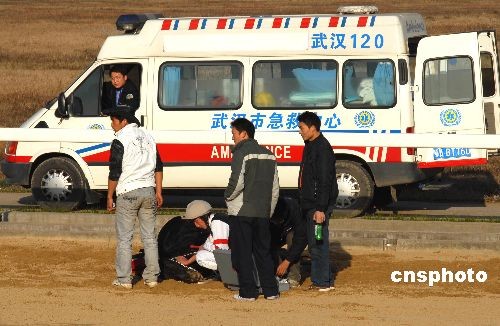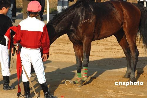 11月30日,在湖北武汉市“东方马城”举行的2008年全国速度赛马锦标赛上,2600米沙地无限定马决赛第二组在比赛时,发生赛马“追尾”惊险一幕。在跑到第二圈进入最后全力冲刺时,新疆队唐旭驾驭的7号马“巴黎之眼”避让不及北京队魏云忠驾驭的10号马“赛速”,两马重重地撞在一起,“巴黎之眼”当场被撞晕倒地不醒,“赛速”右前蹄则被撞断受伤严重,所幸两名运动员均无大碍。据业内人士介绍,赛马运动属于高风险运动,运动员和马匹在激烈的比赛过程中,都有出现意外的可能。中新社发 楚天行 摄