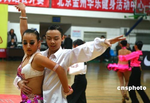 12月6日晚,由IDSA世界体育舞蹈协会(中国)总部和北京金州华乐健身活动中心主办的“IDSA世界体育舞蹈协会(中国)体育舞蹈公开赛”在北京怀柔一中体育馆开赛,来自云南、北京、浙江、重庆等32个省市、地区的800多名体育舞蹈选手参加,创下了体育舞蹈公开赛的新记录。参赛选手最大的年龄70岁最小的只有5岁。公开赛历时二天,共设体育舞蹈标准舞、拉丁舞、“规范”交谊舞团体舞,以及体育舞蹈莎尔莎舞、肚皮舞、时尚流行舞、阿根廷探戈舞等五大系列,比赛分为专业、职业、业余三大组别。这是全国体育舞蹈选手的一次巅峰对决,更是全面展示我国体育舞蹈发展水平的盛会。 中新社发 卜向东 摄