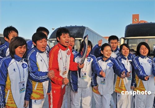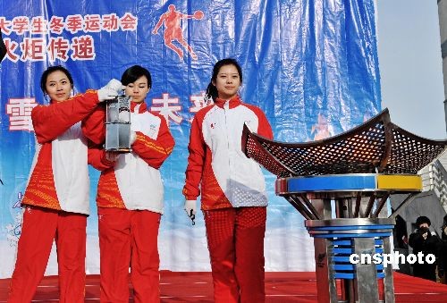 哈尔滨第24届世界大学生冬季运动会火炬传递于2008年12月22日在大庆市传递。传递时间30分钟,路程2.6公里;10时12分大庆市人民政府市长夏立华致词,冰雪使者引回圣火,熄灭圣火盆, 哈尔滨第24届世界大学生冬季运动会火炬传递在黑龙江省大庆市传递圆满结束。中新社发 滨海之光 摄