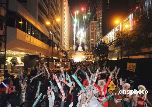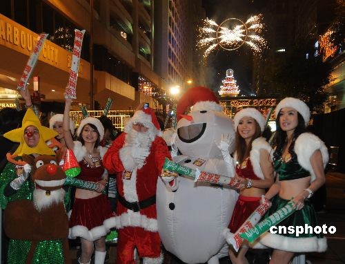 十二月二十四日晚(平安夜),逾十万市民及游客齐聚香港尖沙咀闹市,参加圣诞倒数街头派对,圣诞老人、圣诞女郎及雪人在场助兴,节日气氛浓厚。中新社发 蔡蔓莉 摄