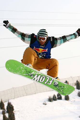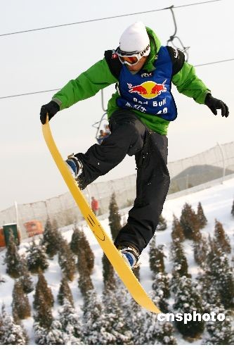 12月28日,第七届红牛南山滑雪公开赛在北京南山滑雪场展开资格争夺,中国近40位单板滑雪高手激烈角逐,最后将有三位胜出的选手在明年一月与世界顶级选手一较高下。中新社发 富田 摄