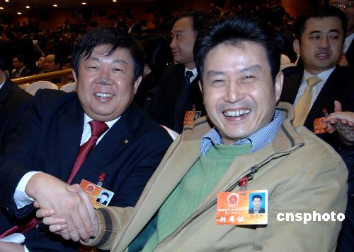 一月十日,全国人大代表、中国女排主教练陈忠和(右一)列席福建省第十一届人民代表大会第二次会议。当日,福建省第十一届人民代表大会第二次会议在福州开幕。中新社发 刘可耕 摄