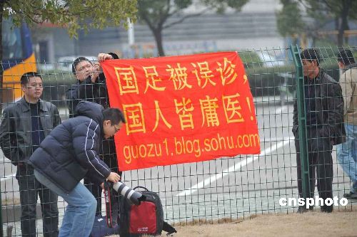 1月21日,国足将在杭州黄龙体育中心应战亚洲杯预选赛的第二个对手越南队。今天,国足来到体育场开始简单热身。现场球迷拉起横幅“国足被误诊 国人皆庸医”,国足队员先后步入球场,执着的球迷依然撑着横幅,站在场外。 中新社发 陈颖 摄