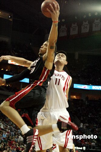 当地时间1月17日晚,主场作战的火箭以93比86战胜热火,姚明全场十二投全中创个人进攻记录。中新社发 欧文 摄