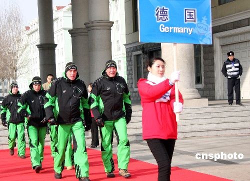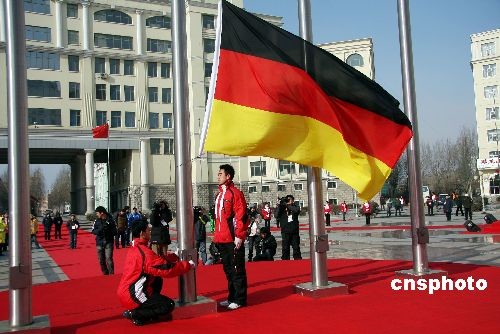 2月14日上午10时,第24届世界大学生冬季运动会德国体育代表团欢迎仪式暨德国体育代表团升旗仪式在黑龙江大学大运村升旗广场举行。大运村执行村长张政文、村长助理张晓光以及德国代表团团长罗兰·约希姆一行6人出席了此次欢迎仪式。这是大运村首次为国外代表团举行的欢迎仪式。中新社发 姚庭山 摄
