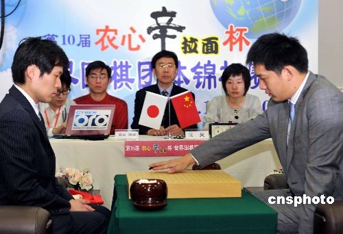 二月十七日,第十届“农心杯”世界围棋团体锦标赛第三阶段比赛在上海举行,首战由中国棋手常昊九段(右)挑战日本擂主高尾绅路九段(左),本阶段比赛将决出最后冠军和2亿韩元冠军奖金的归属。中新社发 汤彦俊 摄