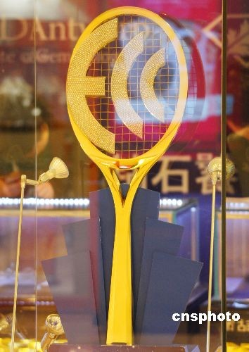 2月19日,来自比利时安特卫普HRD钻石博物馆的“安特卫普钻石杯网球赛冠军奖杯”亮相北京。这座奖杯为网球拍形状,由6公斤黄金和1600颗总计150克拉的钻石打造而成,价值百万欧元。中新社发 吴芒子 摄