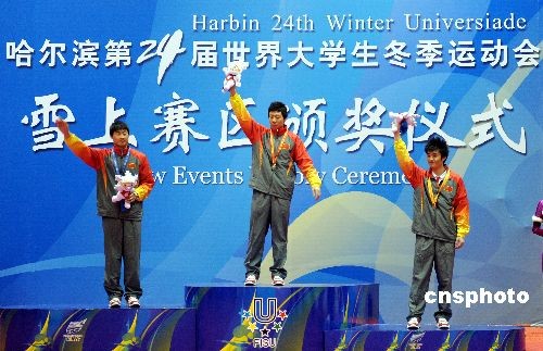 2月23日上午,第24届大冬会第六天,在亚布力滑雪场中国男子运动员包揽了空中技巧个人滑雪的前三名。中新社发 姚庭山 摄