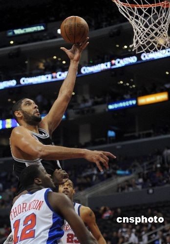 NBA劲旅圣安东尼奥马刺队三月二日晚在客场迎战洛杉矶快船队,结果以106比78大胜主队,马刺队大前锋邓肯全场独得16分。中新社发 张炜 摄