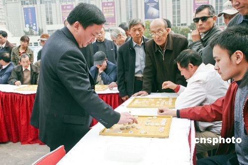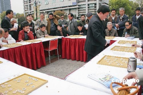 4月7日,中国象棋大师徐天红在南京山西路广场以一对十与群众对弈,吸引了众多市民观看。中新社发 祁恩芝 摄