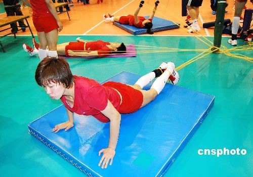 4月9日是由蔡斌担任主教练的中国新一届女排抵达湖南郴州的第二天,队员们开始在郴州体育训练基地腾飞馆开展体能、柔韧方面的恢复性训练。据悉,中国女排集训第一个星期,每天上午进行军事训练,下午是体能、技术方面的综合训练。中新社发 贺茂峰 摄
