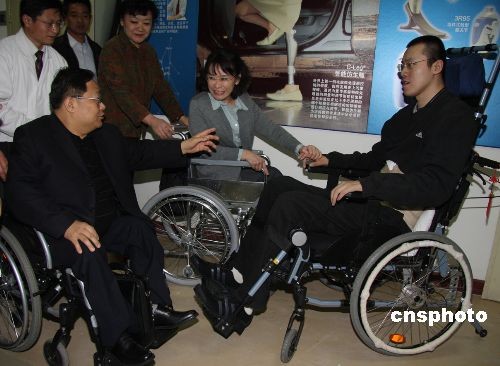 4月15日下午,中国残联主席张海迪在中国残联副主席吕世明(左一)的陪同下来到中国康复研究中心,亲切看望由于在训练中颈髓损伤而接受康复治疗的原中国男排著名运动员汤淼。 中新社发 陈亚伟 摄