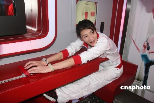 4月18日,悉尼奥运会女子双人10米台跳水冠军李娜在大篷车里测试柔韧性。当日,2009年“李宁英雄大篷车”巡游活动在湖南岳阳启动,体育爱好者们可通过大棚车里的各种设备来测试自己的速度、柔韧、灵敏、平衡等运动素质,从而了解自身的各项运动机能水平。中新社发 邓霞 摄