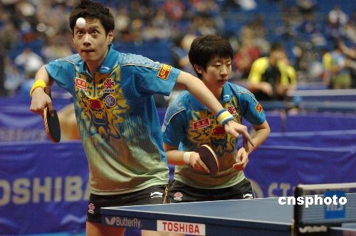 4月29日,中国混双选手邱贻可/李晓丹在日本横滨以4:1战胜一对美国选手,取得第五十届世乒赛的首场胜利。中新社发 朱沿华 摄